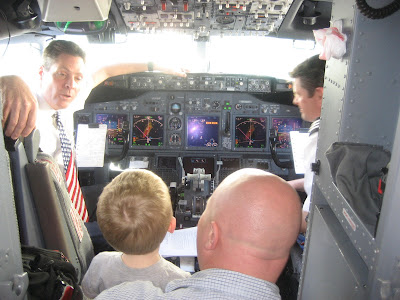 So, thankfully for ALL involved, Scott and Austin were able to get off the plane and walk around the El Paso airport for a while. On their way out the plane door (is it called a "door"?!) they got to stop by the cockpit for a look. The SW pilots are amazing! They really took their time with Austin and allowed him to sit in the main seat and yes - even touch a few things! They even let him push a button that talked to the airport tower operater! It was amazing!